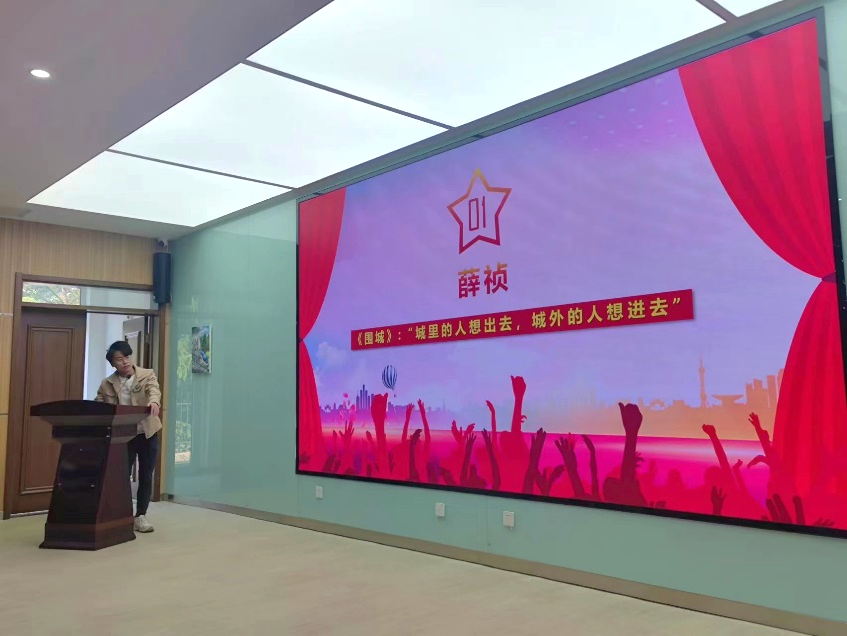薛祯同学同大家分享了“最喜欢的一本书”——《围城》,并且分享自己最喜欢的一句话:“城里的人想出去,城外的人想进去”,引人深思。作为当代大学生,我们应当努力奋斗、拼搏进取、校正心态、胸能容物,努力去追求自己美好的未来。