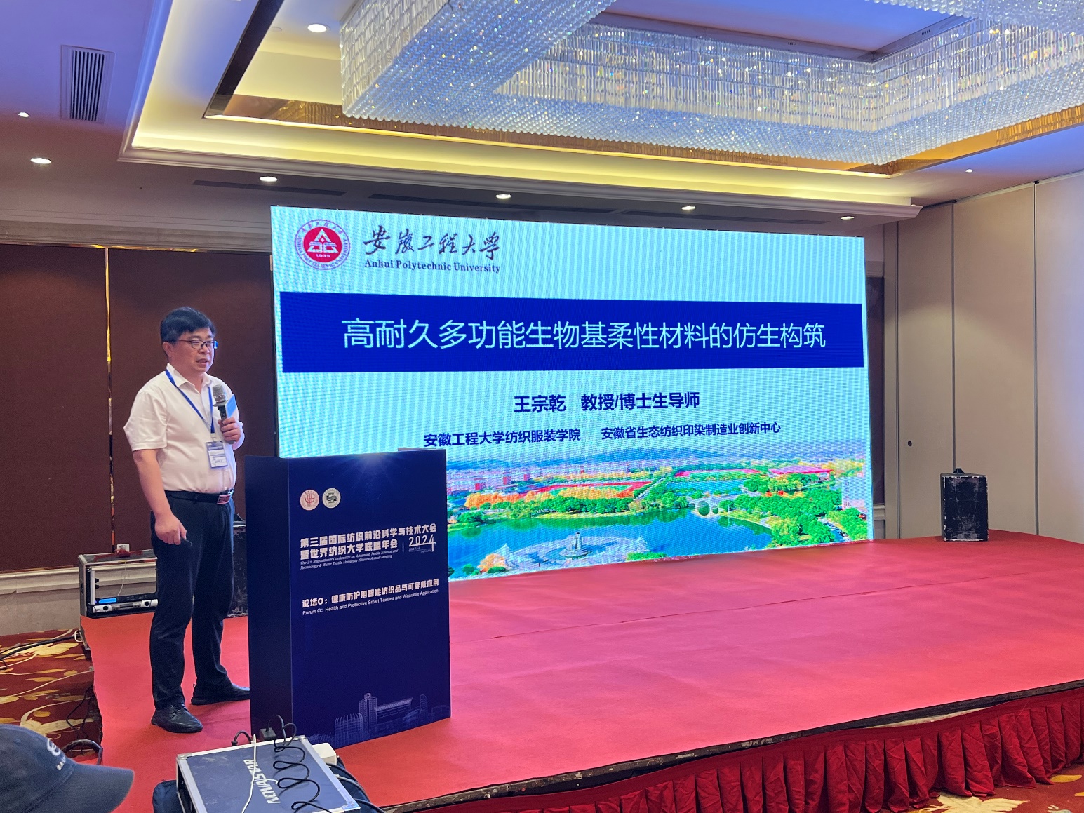 随后,安徽工程大学王宗乾教授作《高耐久多功能生物基柔性材料的仿生构筑》报告,王老师从高耐久多功能个人热管理蚕丝织物的仿生构建、高稳定导电油墨的仿生制备及其应用性能、多功能超弹性SMNF基气凝胶的仿生构筑三个方面进行了精彩详细的讲解。