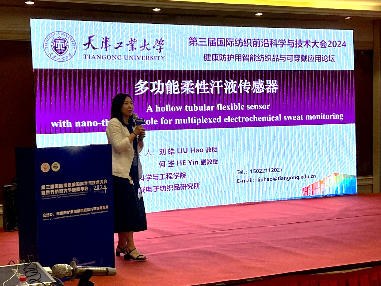 天津工业大学何崟副教授作《多功能柔性汗液传感器》报告,何老师详细介绍了多功能纤维基汗液传感器的结构设计、集成技术及其可穿戴应用,并介绍了智能精确控温保暖服装服饰系列产品。