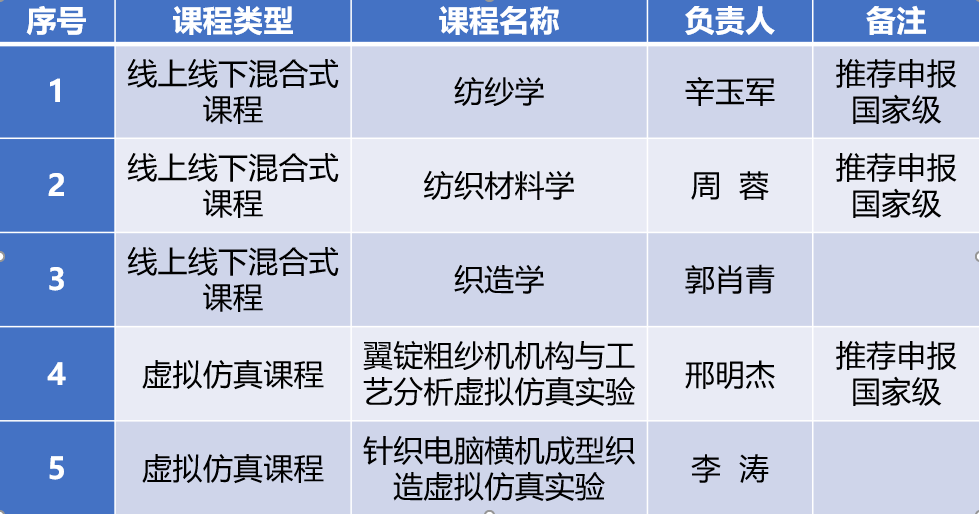 近日,山东省教育厅公布第二批山东省一流本科课程认定结果,亚洲十大赌博网站热门推荐 共有5门课程成功入选,入选数位列全校第2名。其中,辛玉军老师负责的《纺纱学》、周蓉老师负责的《纺织材料学》、邢明杰老师负责的《翼锭粗纱机机构与工艺分析虚拟仿真实验》获推荐申报国家级一流本科课程。