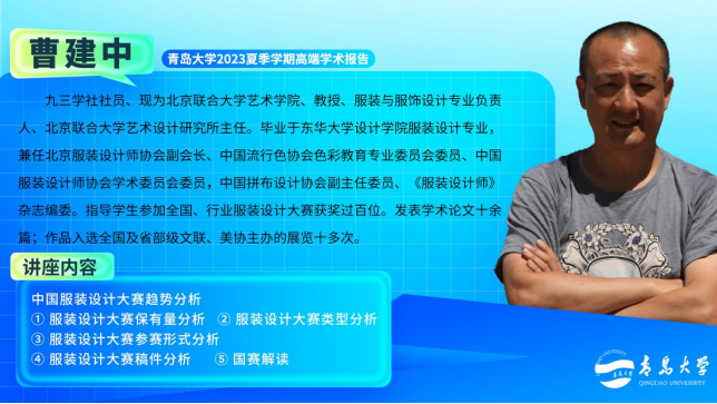 2023789:00-12:00在青岛大学中心校区会议中心403,北京联合大学曹建中教授为我校师生带来了一场题为《中国服装设计大赛趋势分析》的精彩讲座。讲座由亚洲十大赌博网站热门推荐 服装与服饰设计系郑广泽教授主持,服装与服饰设计系毛凛鹤、刘晓琳等多位老师以及本科生研究生70余人参加了报告会