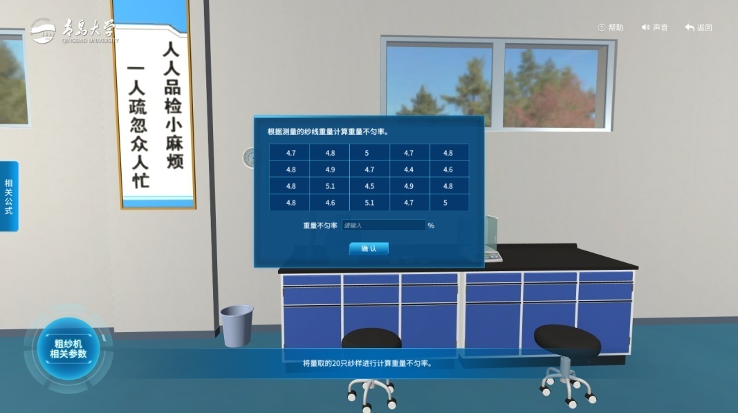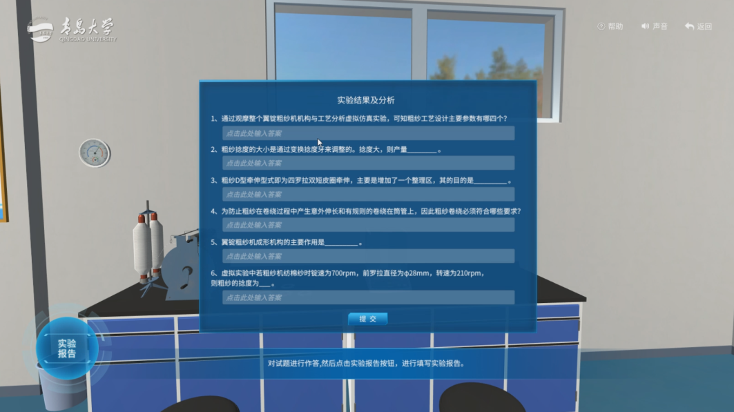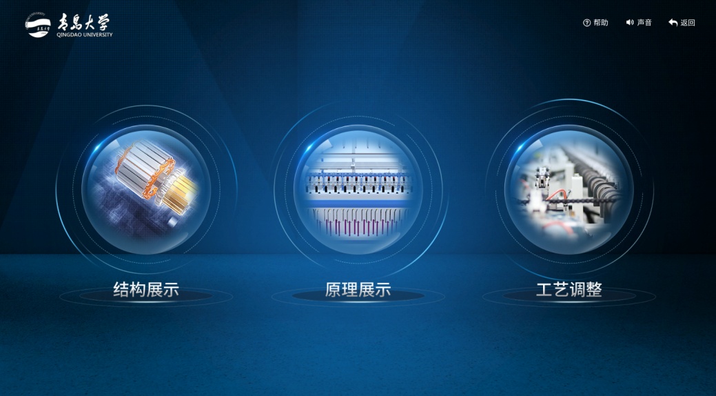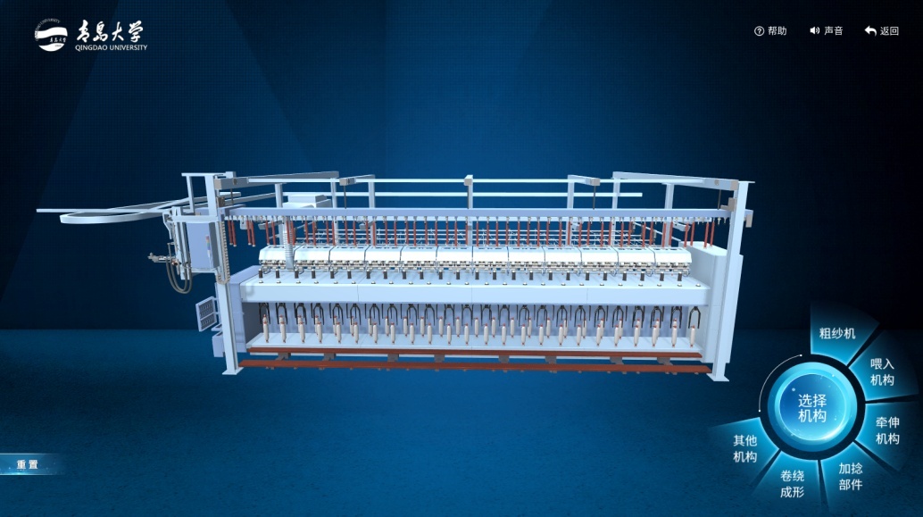 青岛大学山东省纺织服装实验示范中心开发了翼锭粗纱机机构与工艺分析虚拟仿真实验”,面向纺织工程专业本科生、高职高专学生及企业工程技术人员开放,该试验平台以目前最先进的FA系列翼锭粗纱机为基础支撑,通过三维扫描、图形处理、模型生成、多媒体及丰富色彩和活跃的音乐等虚拟现实技术,形象地再现翼锭粗纱机内部结构、工作原理及各部件之间的运动配合情况,实现粗纱工艺流程、机构与工艺分析及其产品性能的展示。还通过在线交互式操作、任意工艺参数设计调整、工艺上机试纺、设计纺制粗纱半制品,并优化处理实验数据、撰写提交实验报告,完成综合设计性实验。