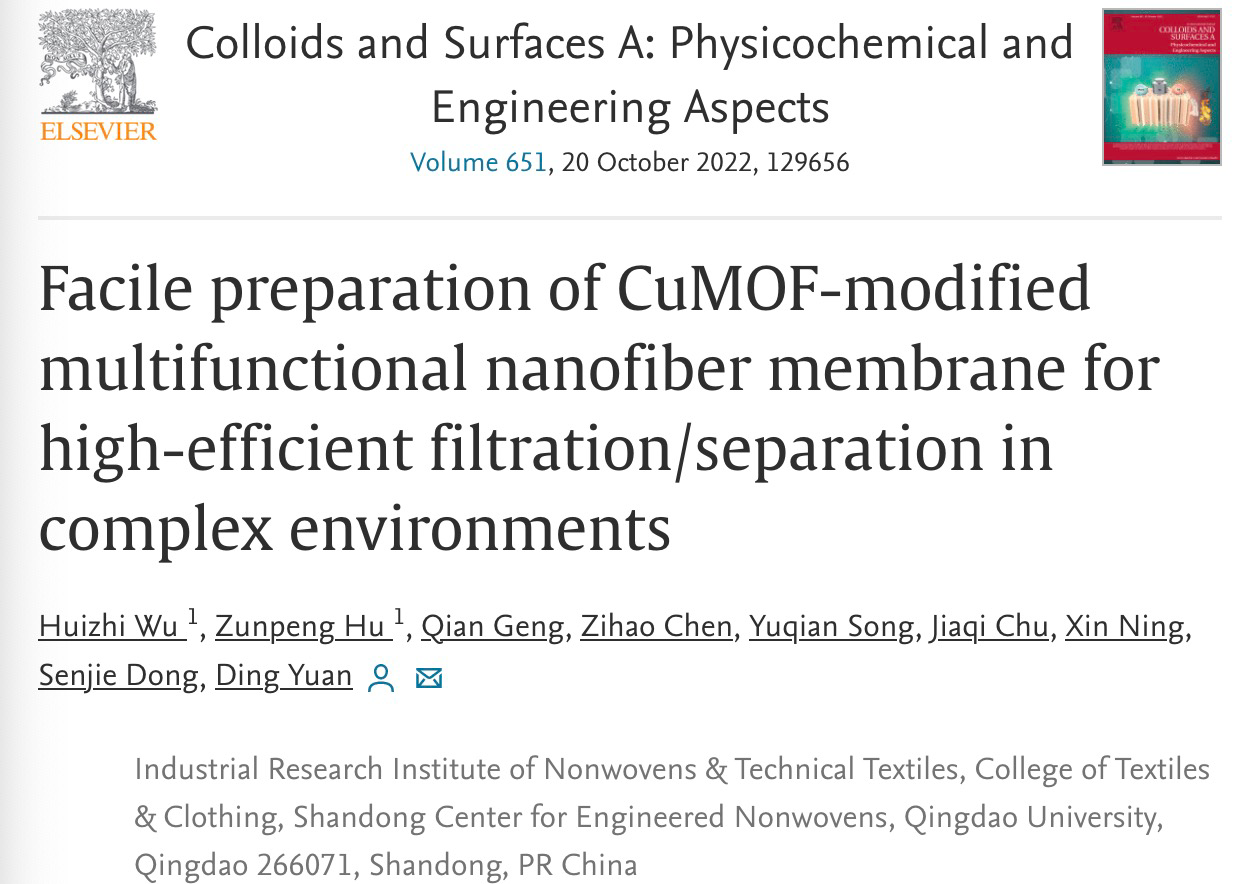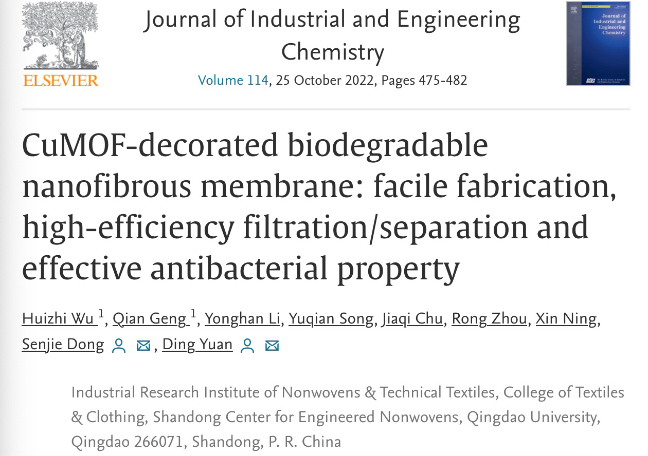 2019级纺织工程专业吴慧芝针对传统的纤维过滤材料(如熔喷纤维、玻璃纤维等)难以同时有效过滤细颗粒物(PM2.5/ PM0.3)和灭活空气中病原体的缺陷,通过改变纳米纤维的组分和结构,构筑出具备出色综合性能的复合纤维膜材料,该研究为应对复杂环境下的空气过滤和油水分离等问题提供一种有效的方法。其中一项成果以“CuMOF-decorated biodegradable nanofibrous membrane: facile fabrication, high-efficiency filtration/separation and effective antibacterial property”为题发表在SCI期刊《Journal of Industrial and Engineering Chemistry》上(DOI:10.1016/j.jiec.2022.07.037, IF=6.760);另一项成果以“Facile preparation of CuMOF-modified multifunctional nanofiber membrane for high-efficient filtration/separation in complex environments”为题发表在SCI期刊《Colloids and Surfaces A: Physicochemical and Engineering Aspects》上(DOI:10.1016/j.jiec.2022.07.037, IF=5.518)。两篇论文的第一作者均为吴慧芝,指导教师和论文通讯作者系袁丁副教授,青岛大学为第一完成单位。