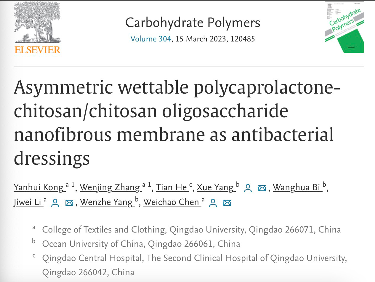 2018级纺织工程专业孔艳辉针对壳聚糖低水溶性限制其抗菌功效的问题,将高水溶性的壳寡糖(COS)引入壳聚糖(CS)纳米纤维作为亲水层,疏水性聚己内酯(PCL)纳米纤维膜为疏水层,构筑了一种非对称润湿性纳米纤维敷料。COS的引入提高了CS层的润湿性、吸水性以及抗菌性,PCL层可以防止水和细菌对伤口的污染,该研究为新型高性能医用敷料开发提供新的见解,成果以“Asymmetric wettable polycaprolactone-chitosan/chitosan oligosaccharide nanofibrous membrane as antibacterial dressings”为题发表在SCI期刊《Carbohydrate Polymers》上(DOI: 10.1016/j.carbpol.2022.120485,IF=10.723)。孔艳辉系论文第一作者,通讯作者系陈为超教授与李纪伟副教授,青岛大学为第一单位和通讯单位。